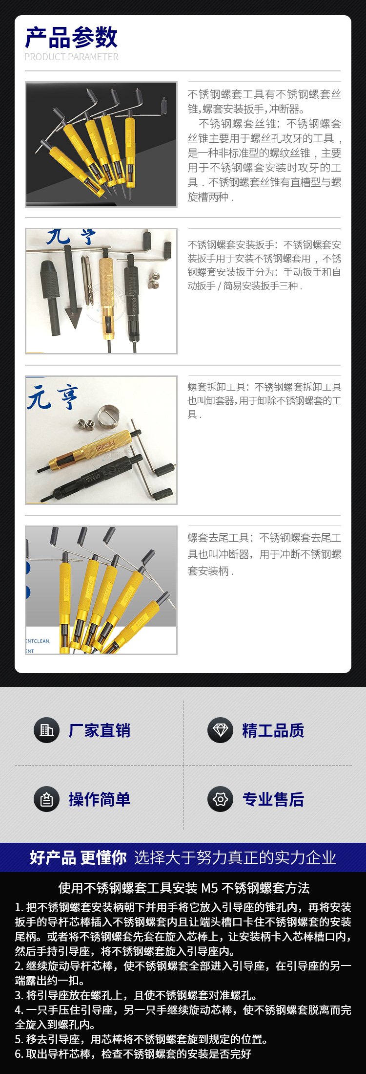 簡易螺紋護套安裝工具有螺紋頭、光桿兩種。用于少量安裝,一般維修、實驗時用,操作時不易安裝,鋼絲螺套容易報廢。